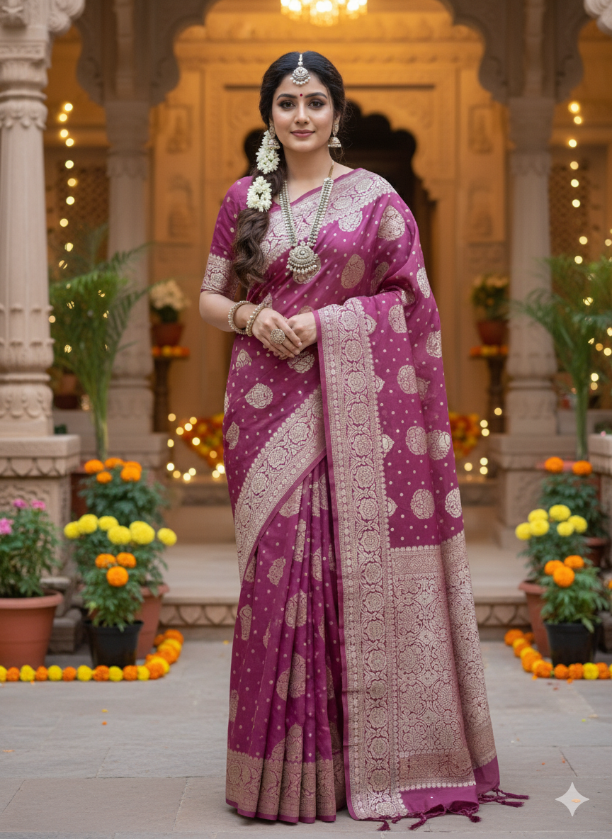 Woven with real zari on fine chiffon silk, it captures the perfect balance of grace and grandeur — airy in texture, yet regal in appeal. Ideal for festive gatherings, evening rituals, or intimate celebrations, Gulbahaar is a saree that drapes you in tradition and tenderness.
