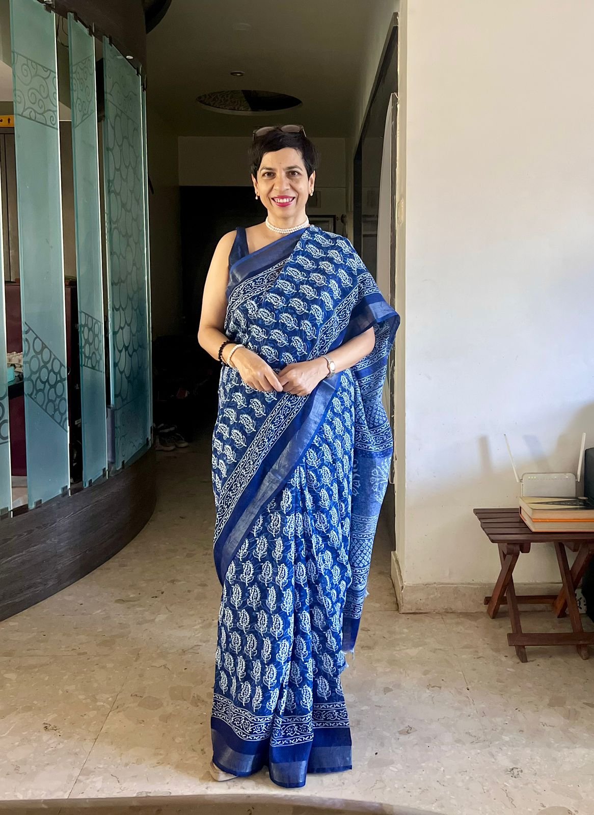 The deep indigo body is balanced by a rich blue border and a beautifully printed pallu, giving this saree a refined, heritage-led presence. Linen adds natural breathability and elegance, making it perfect for long days, warm afternoons, meetings, or mindful gatherings.