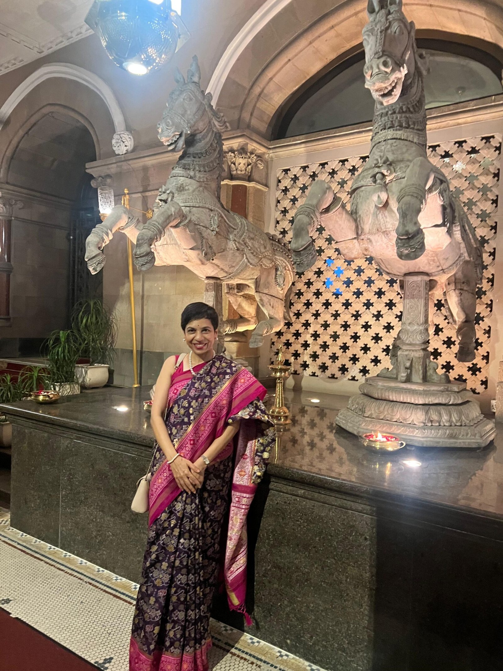 “Rajeshwari” — meaning the Queenly One — embodies timeless sophistication and the royal artistry of Gujarat’s Patola weave. This exquisite semi Patola single ikat saree is woven in a rich plum base, adorned with traditional geometric and floral motifs in hues of gold, magenta, and ivory.