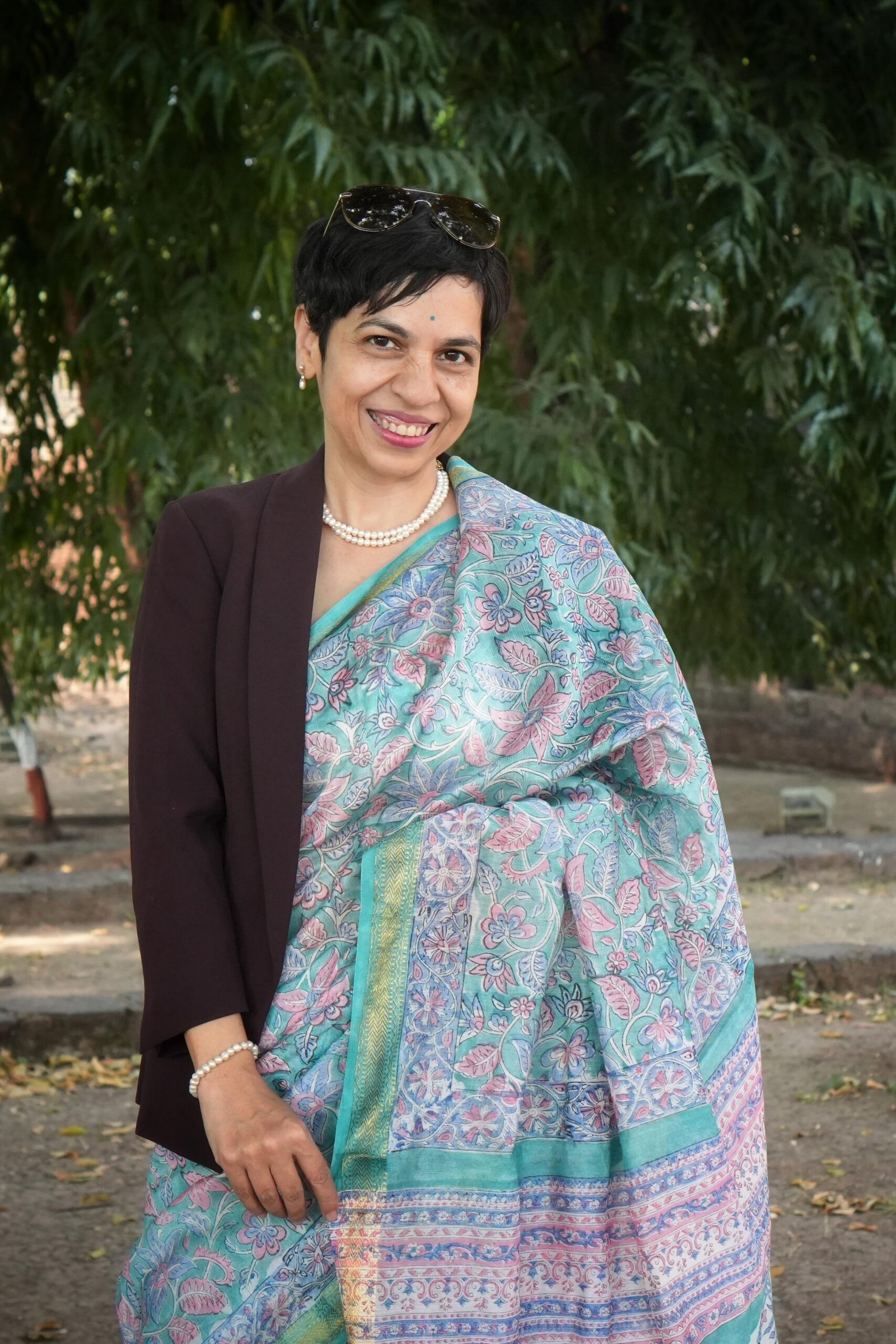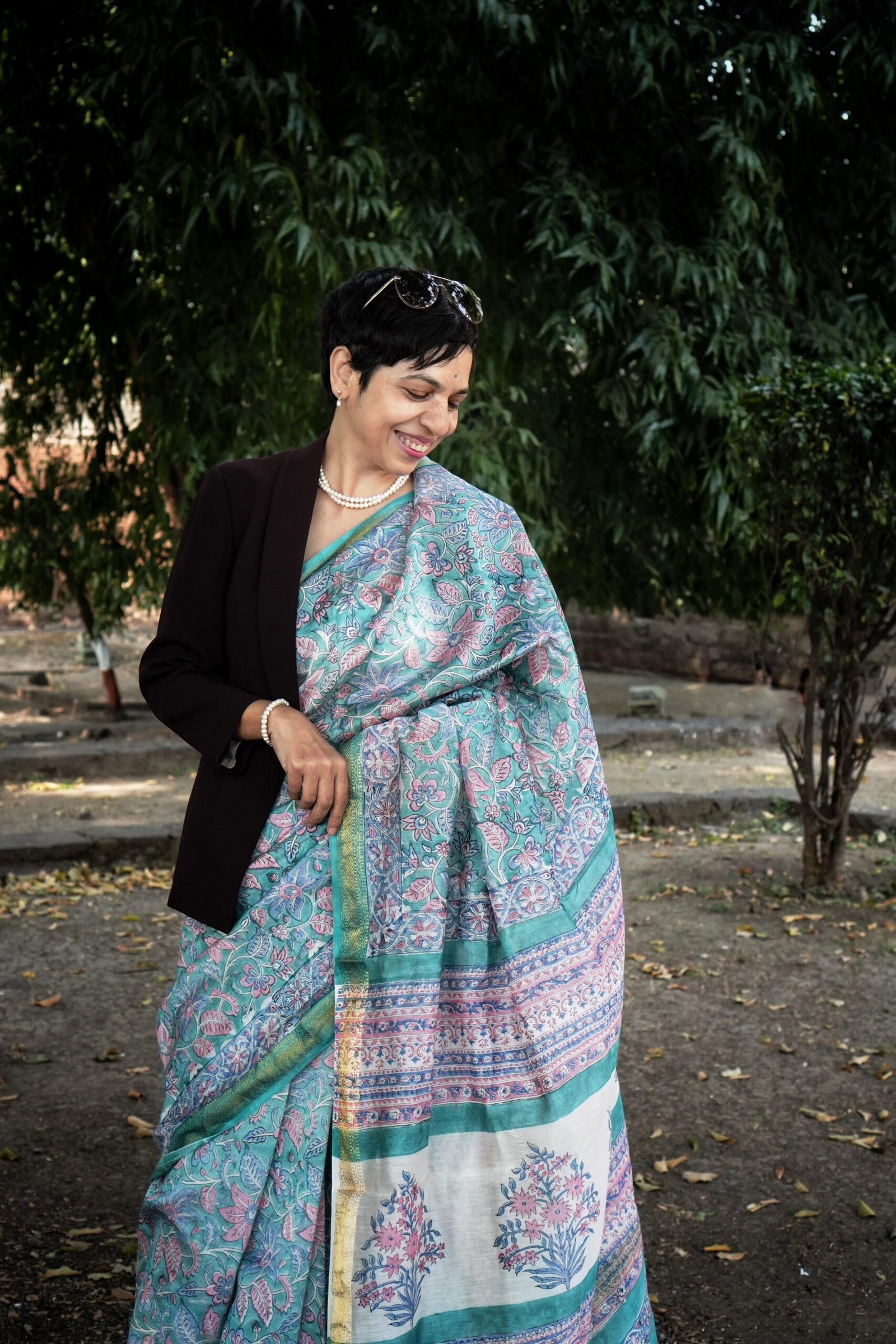 Sameera is a breath of soft sky and gentle wind — a handblock-printed Chanderi saree crafted for women who embody quiet strength and effortless grace.