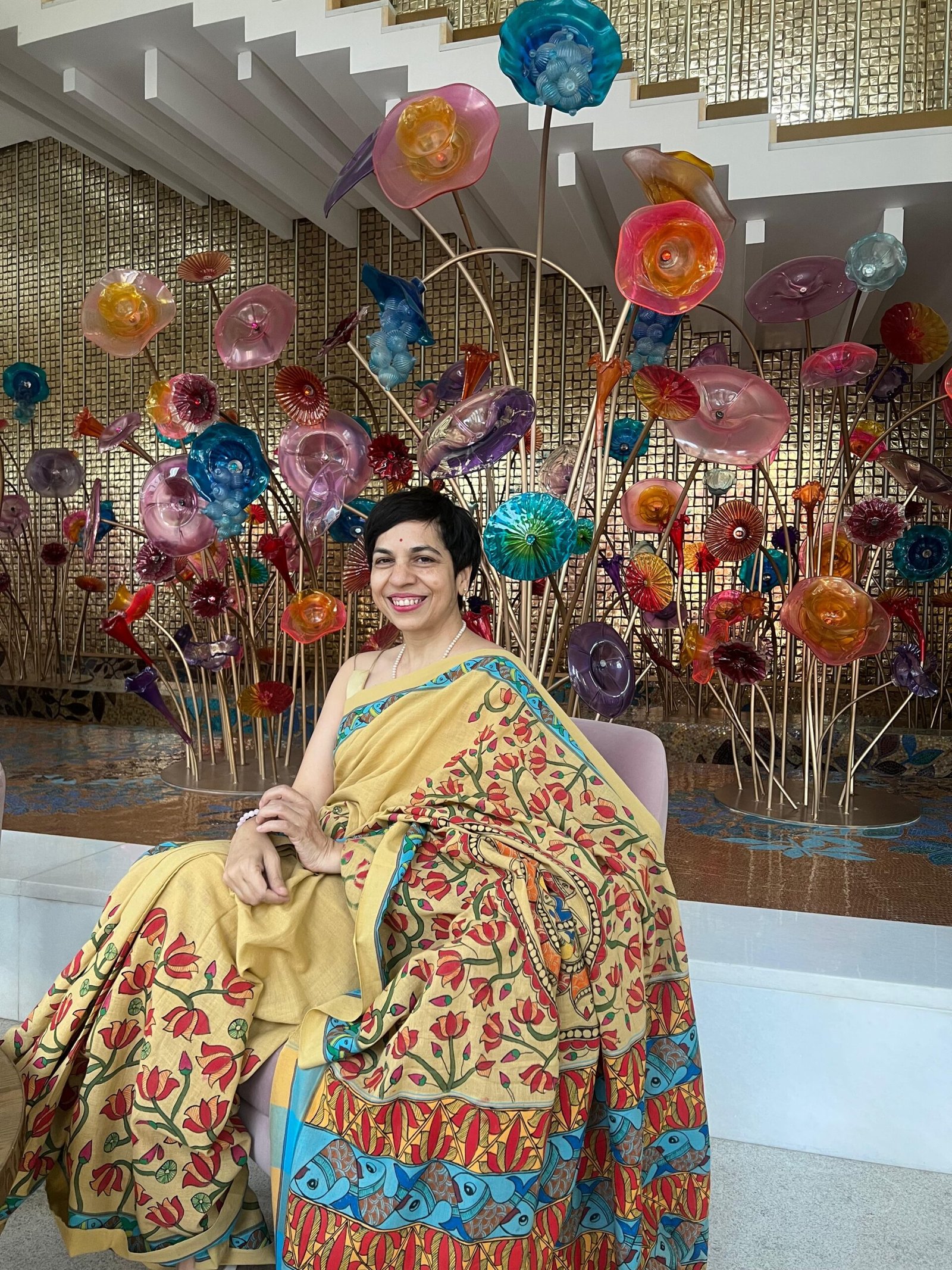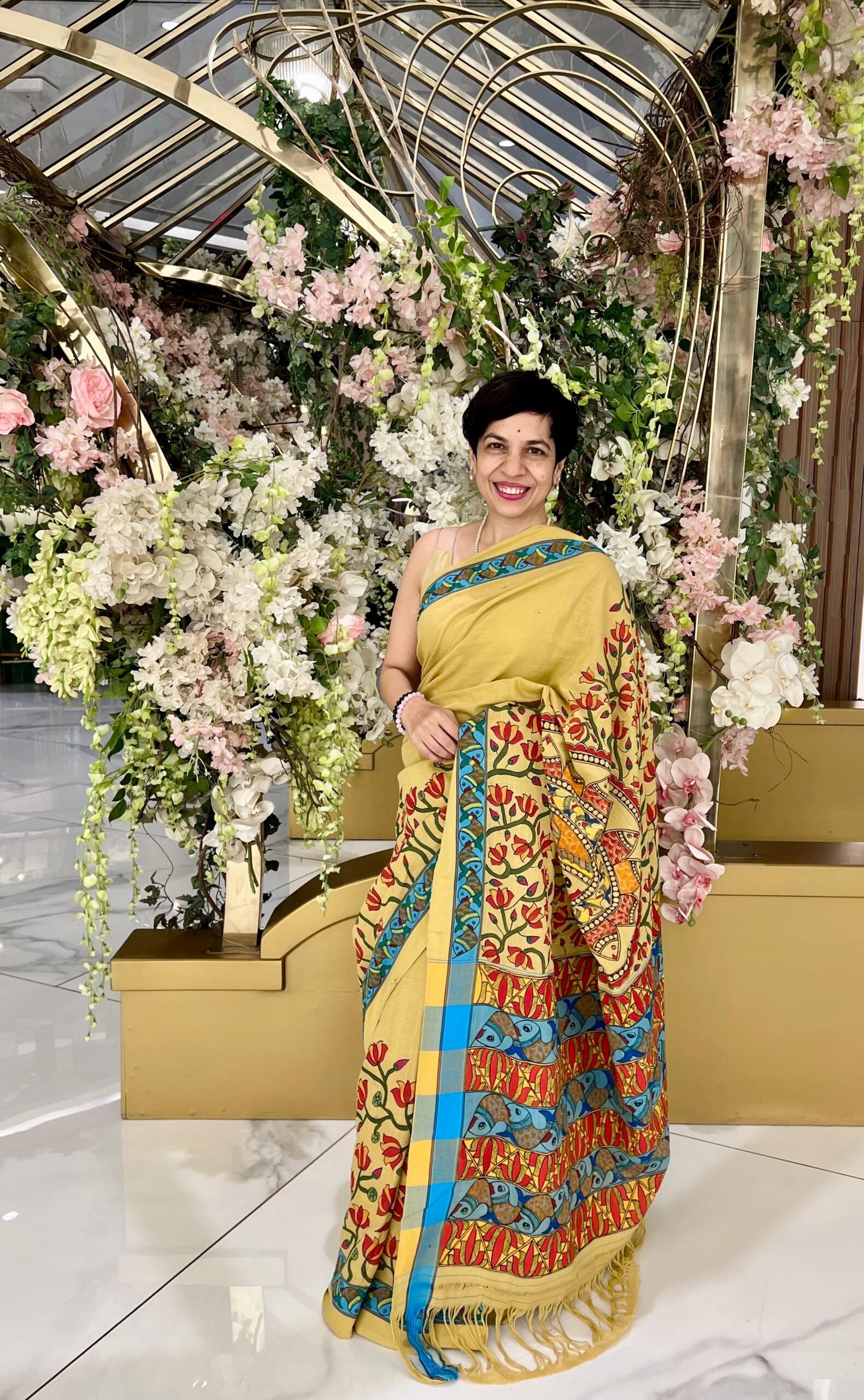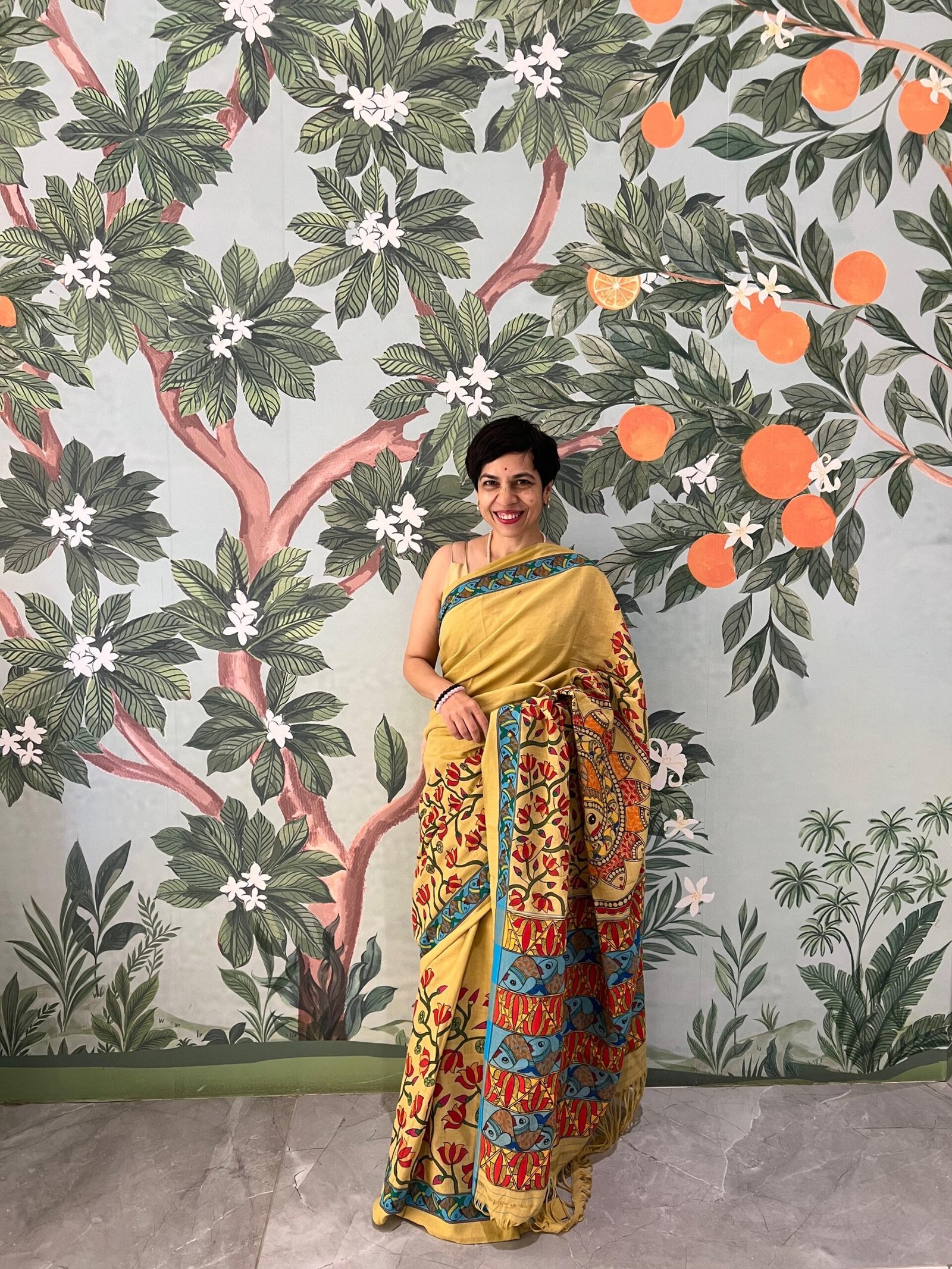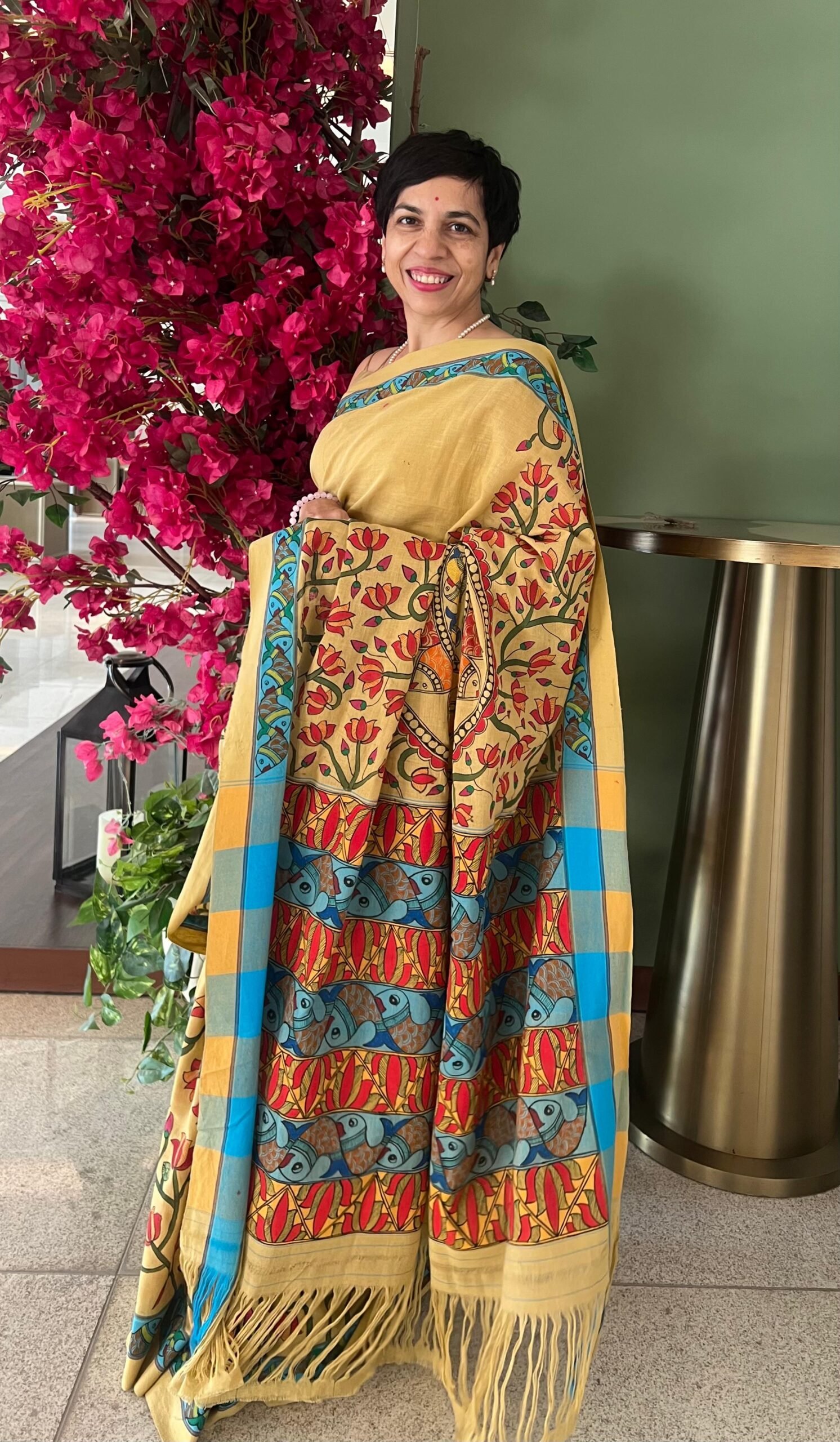 Adorned with motifs of blooming flowers and flowing fish, Vaidehi embodies abundance, fertility, and grace — each stroke drawn by hand using natural pigments on sustainable cloth. The gentle mustard hue forms a tranquil base, while red florals and blue borders breathe joy and vibrance into the weave.